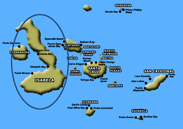 The vast lava flows of six major and numerous smaller volcanoes have uplifted and joined over a millions of years to form what is now the island of Isabela. By far the largest landmass in the Galapagos, Isabela measures more then 130 km from north to south and 70 km at its widest point. Isabela has several unique animals, including the worlds's only surviving population of mangrove finch, and giant tortoises that have been isolated long enough on their respective volcanoes to evolve into distinct subspecies.