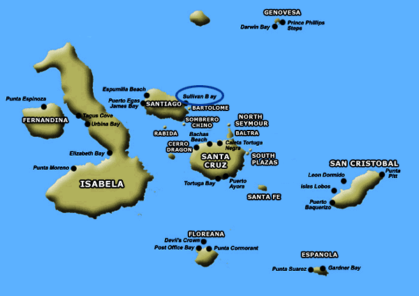 On the coast marks the edge of a vast lava flow that spewed out as recently as 1900. Only but a few plants have colonized the lava's barren surface and only lava lizards hunt over the twisted loops of pahoehoe lava among pioneering mollugo and lava cactus. Like adjacent Bartolome, Sullivan Bay is mainly of interest because of its evidence of volcanism. It is an almost alien landscape. You will find there is a tiny landing beach which you might see 'alapagos penguins, and despite the bareness of the landscape, the ocean is teaming with life which makes the snorkeling fantastic here.