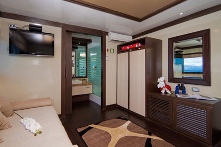 The Grand Odyssey was commissioned in February 2011. This is the luxury ship like no other. The Grand Odyssey combines luxury, privacy, and comfort in the enchanted islands of the Galapagos. The Grand Odyssey boast a capacity for 16 passengers, it features 8 spacious matrimonial suites (approx. 25m squared) and 1 Master Suite (approx. 35m squared) all equipped with panoramic views of the islands, private bathrooms, hot/cold water, air conditioning with independent controls, mini bar, TV. One of the rooms has a faux queen bed which separates into 2 Twin beds and is a connected suite for families. You will also find during your experience the exquisite dishes created by the chef. There is a large large solarium with shaded and uncovered areas, two Jacuzzis, sun loungers and a Mini Spa offering therapies and massages. Social areas include Saloon, mini library and video library and a play zone for kids (during family departures). |